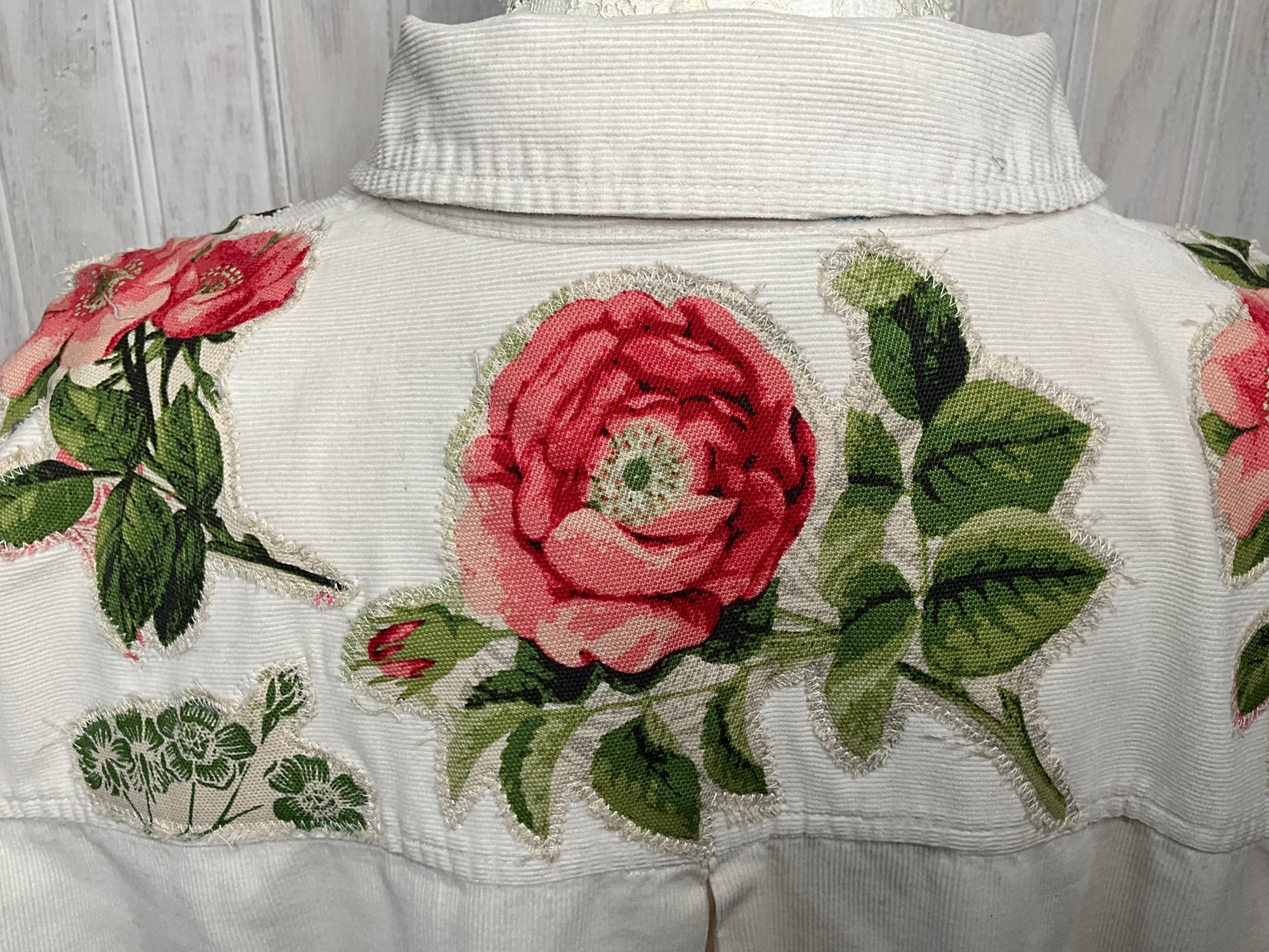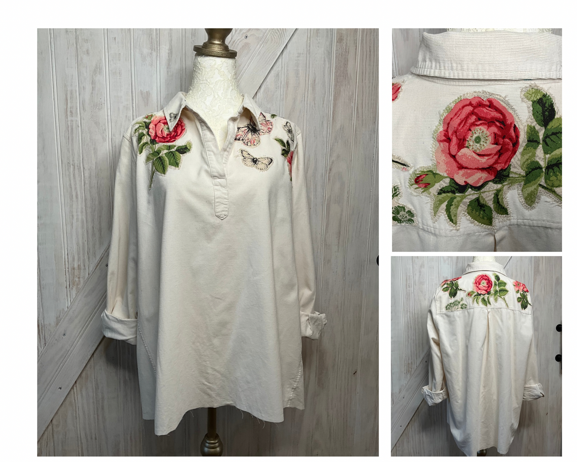 This playful upcycled cream corduroy shirt features a lightweight, softly textured fabric perfect for a casual yet charming look. Adorned with bold rose appliqués in vibrant reds and pinks on the shoulders and back, plus two delicate butterfly accents on the front, it brings a whimsical, vintage-inspired vibe. The tapestry-like appliqué adds a lovingly handcrafted detail, while the classic collar keeps it timeless. Perfect for adding a touch of nature and romance to any outfit.