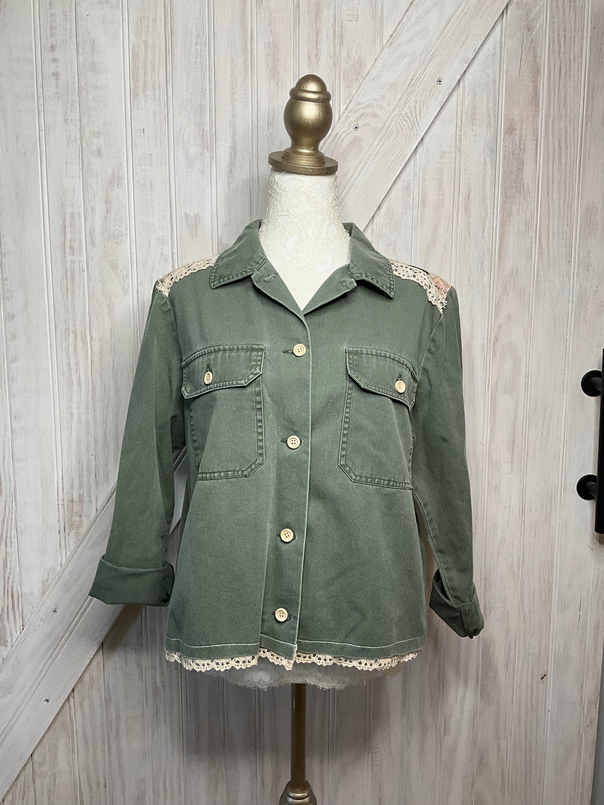 Upcycled Sage Twill Jacket with Floral Appliqué and Lace Trim